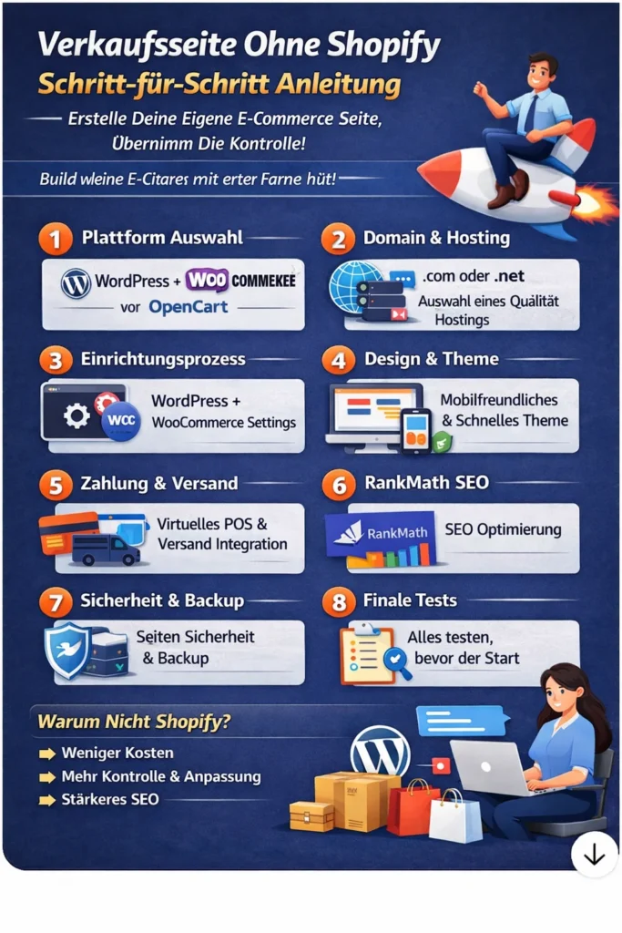 Um online zu verkaufen, musst du nicht zwingend Shopify nutzen. Wenn du die passende Infrastruktur wählst, kannst du deinen Shop unter eigener Kontrolle aufbauen – langfristig oft flexibler und unabhängiger. In diesem Leitfaden erkläre ich dir die Schritte, um ohne Shopify einen Onlineshop zu erstellen: Plattformwahl, Domain & Hosting, Einrichtung, Zahlung & Versand, RankMath-SEO und die Vorbereitung für den Launch – als klaren Plan.