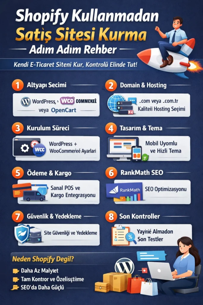 Online satışa başlamak için mutlaka Shopify kullanmak zorunda değilsin. Doğru altyapıyı seçerek, kendi kontrolünde ve uzun vadede daha esnek bir şekilde satış sitesi kurma sürecini tamamlayabilirsin. Bu rehberde Shopify olmadan satış sitesi kurma adımlarını; altyapı seçimi, domain-hosting, kurulum, ödeme-kargo, RankMath SEO ve yayına hazırlık olarak net bir planla anlatıyorum.